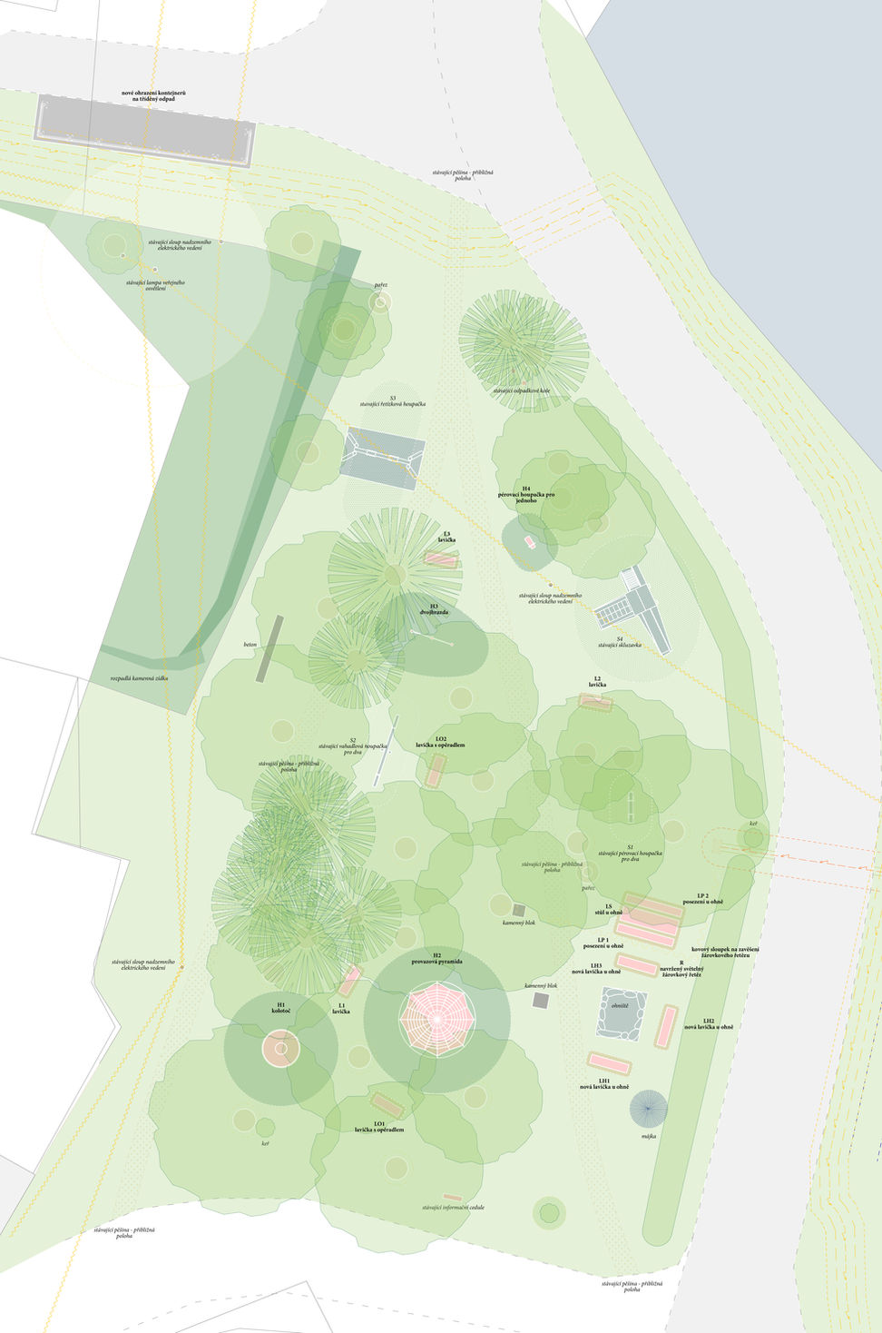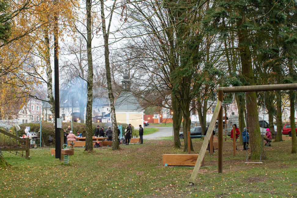 Realizace dětského hřiště na návsi ve Lhotě u Stříbra navazuje na předešlou studii, která řešila celkovou koncepci středu obce. Úkolem bylo mezi už existující herní prvky v příjemném parčíku pod korunami stromů umístit herní prvky nové, podle výběru místních obyvatel, aniž by byla narušena klidná atmosféra místa. K tomu bylo třeba navrhnout nové lavičky a posezení u ohniště, kde s místní rádi setkávají k různým příležitostem. Neposledním úkolem také bylo zkultivovat místo s nádobami tříděného odpadu, které je nově od parčíku vizuálně odděleno pomocí dřevěného ohrazení. Veškeré nové prvky byly provedeny z nebarveného dubového dřeva, kovové a plastové detaily byly sladěny do stejného tyrkysového odstínu. Dopadové plochy všech herních prvků jsou nově travnaté. Kačírek, který sloužil jako dopadová plocha pod původními prvky, se místním neosvědčil a tak byl z místa odstraněn, nicméně jeho část je znovu použita v okolí laviček a posezení, pro jejich pohodlnější užívání i údržbu.